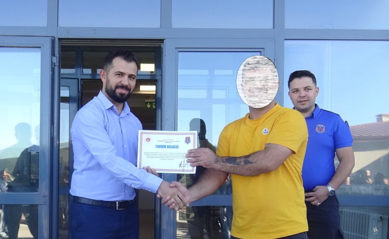 Akdağmadeni Açık Ceza İnfaz kurumu müdürlüğü Eğitim Birimi tarafından yapılan kurs ve etkinliklere katılımları dolayısı ile iki hükümlümüze belge verildi. Hükümlülerin belgeleri İdare Memuru Yusuf Enes İman ve Kurum öğretmeni Mikail Hasdemir tarafından kendilerine verildi. Taktir belgesi alan hükümlüler ile fotoğraf çekidi.